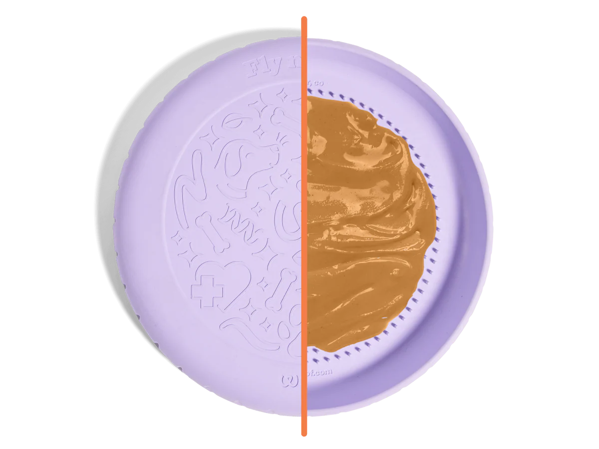 Fly n’ Feed is the flying disc with a secret superpower—it flips into a calming lick mat. Lightweight yet durable, toss for high-energy fetch, then flip to reveal dual-texture lick zones that help pups unwind after play. Rolls up for travel, pops flat for storage, and even doubles as a water dish. Made from tooth-friendly, scuff-resistant rubber and dishwasher safe. Pairs perfectly with Woof LickMix or your pup’s favorite spread.