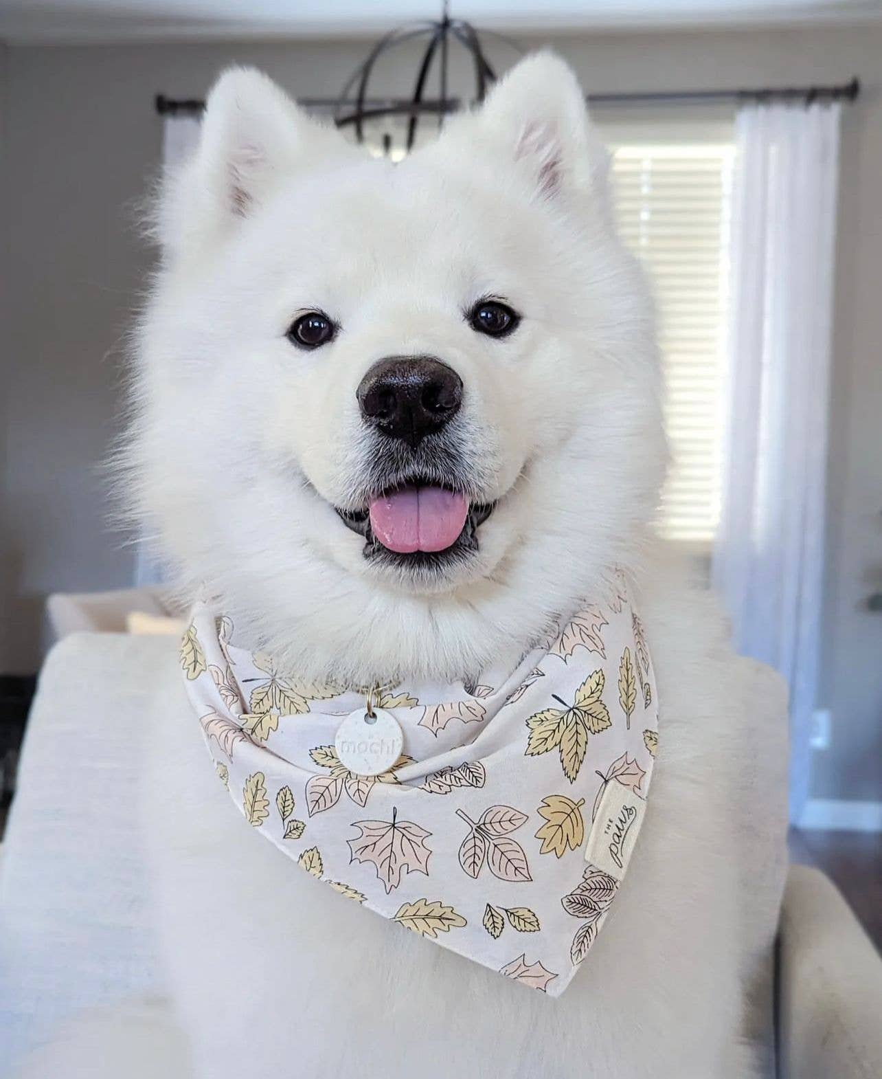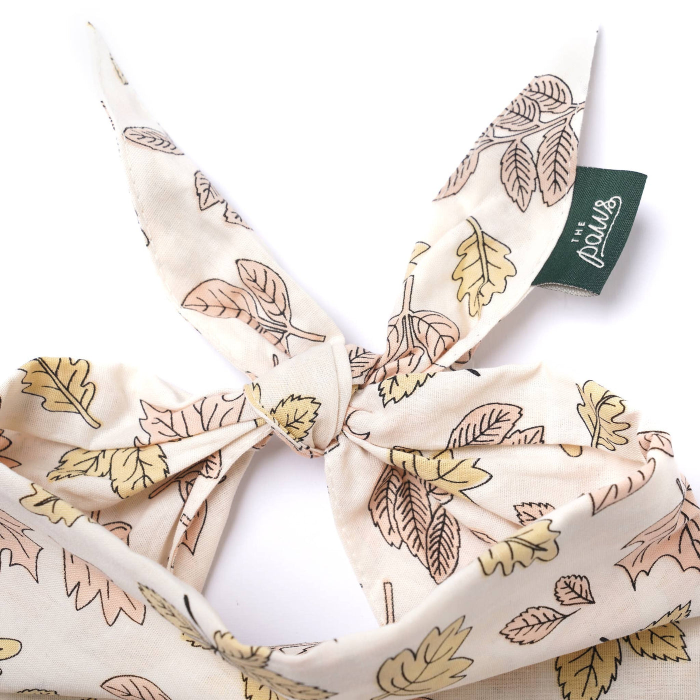 Falling leaves in soft fall colors Tailor cut double sided dog bandanas - sized & ready to tie on - Triangle shape, no folding needed • Your preferred packaging is selected after ordering *any packaging option is included in the unit price • 100% Cotton • Handmade in Bali Machine washable / Tumble dry Bandanas & quality small batch pet products, thoughtfully made on the island of Bali